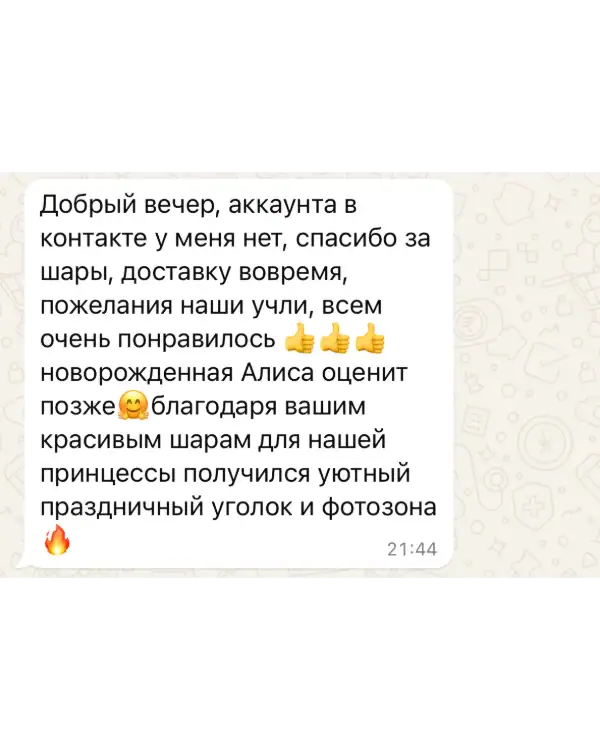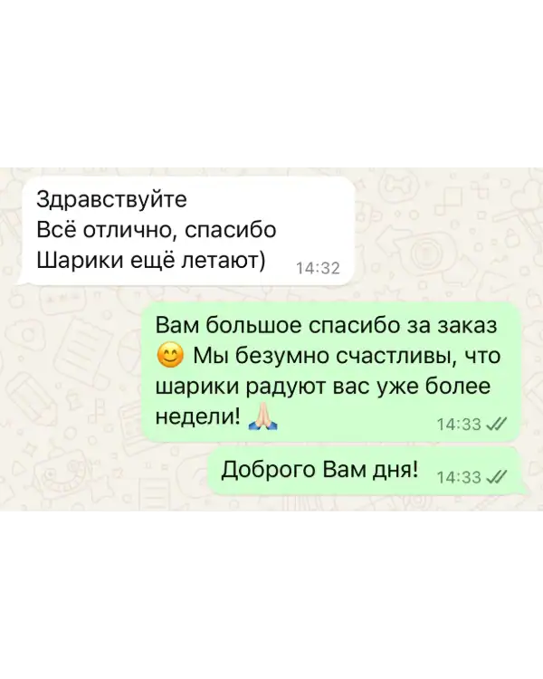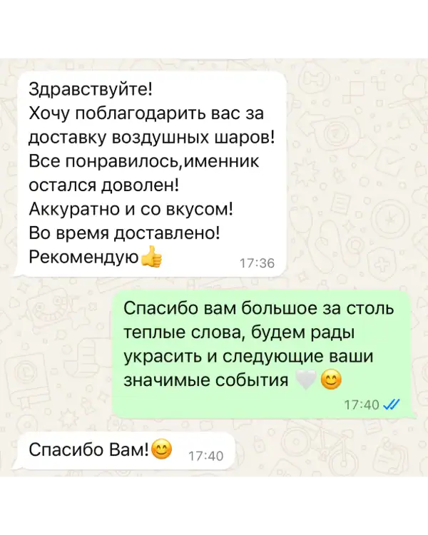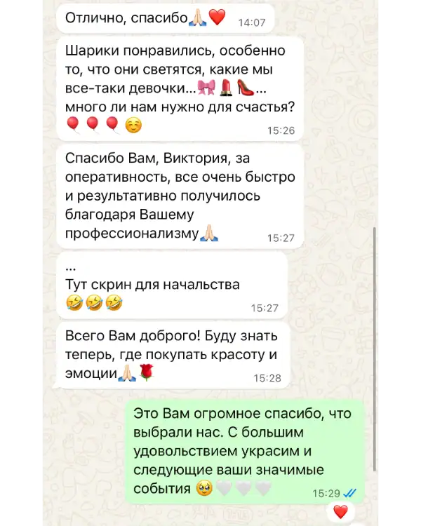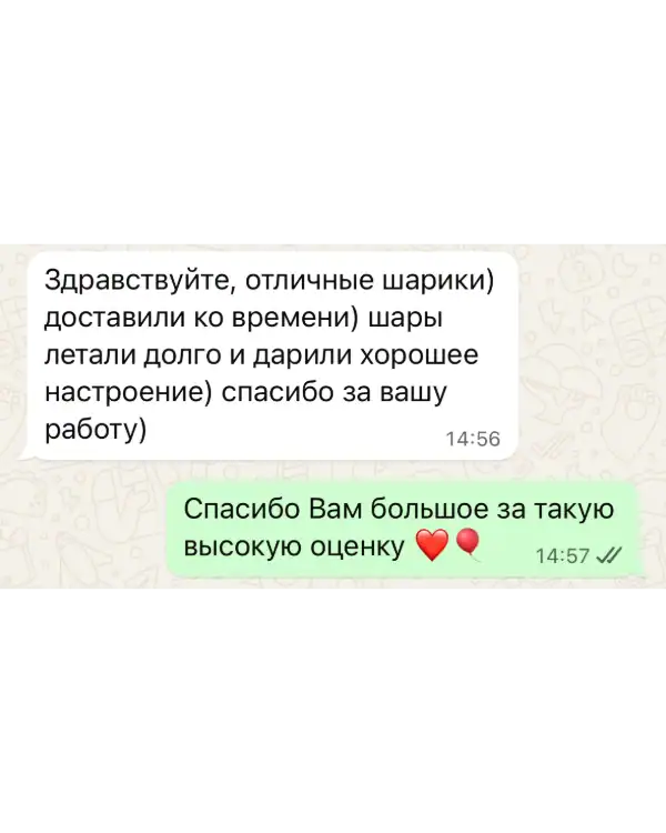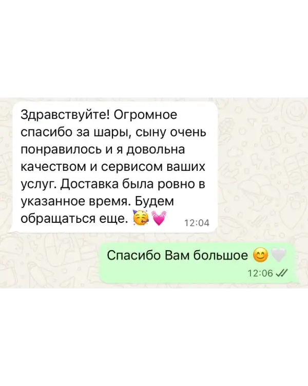 Для нас важны не только качественные воздушные шары, но и высокий уровень сервиса. Мы всегда готовы выслушать пожелания и оперативно ответить на вопросы по срокам, доставке и оплате.