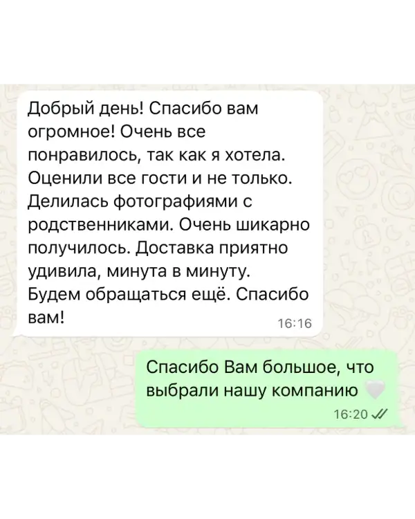 Мы понимаем, что во время подготовки могут возникать срочные изменения. Круглосуточная поддержка позволяет оперативно скорректировать заказ, уточнить детали доставки или дополнить оформление.