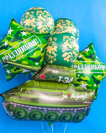 • Фольгированные шары: Шары в форме звезд, танков, самолетов или других символов мужества и силы.